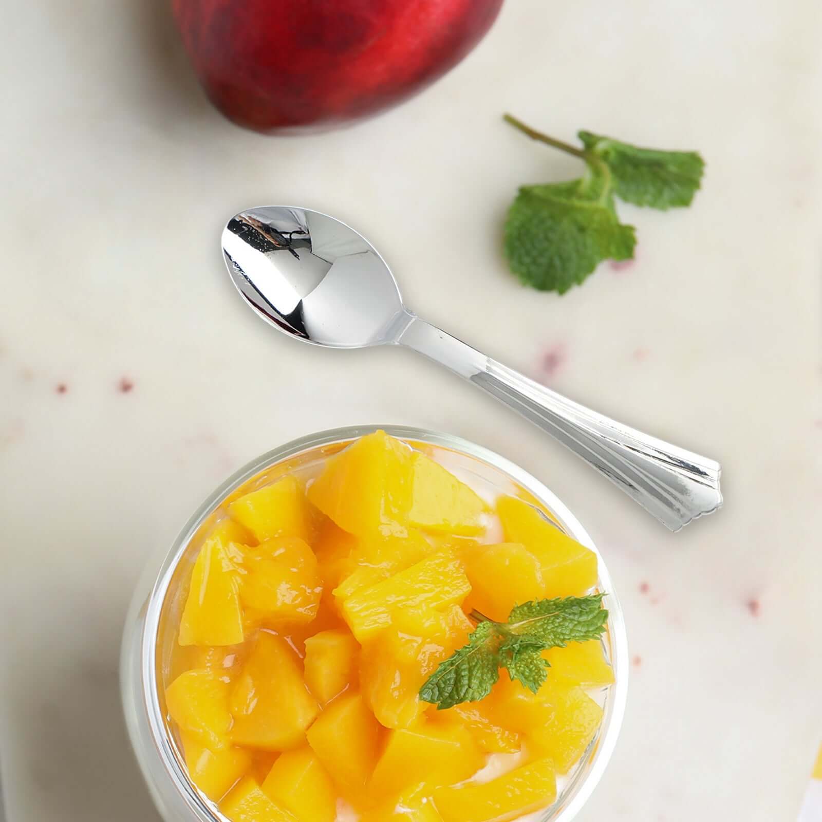 Create an elegant and sophisticated presentation at your upcoming special event or a festive meal with these classy disposable plastic dessert coffee spoons. Our astounding Sorrentine Collection of plastic coffee spoons combines the convenience of plastic with the charismatic appeal of real glass. With these beguiling spoons. make your cleanup time a cinch for any occasion. Whether its a jubilant birthday party or a festive wedding reception. These coffee spoons are an ideal choice for cakes. side dishes. salads. cereals. desserts. appetizers. and more. These disposable clear plastic dessert coffee spoons are strong and sturdy. thus will avoid the spilling of food while eating. During exciting indoor events and summer fun activities. make dining and tidying a breeze with our special Disposable Silverware Dessert Spoon.