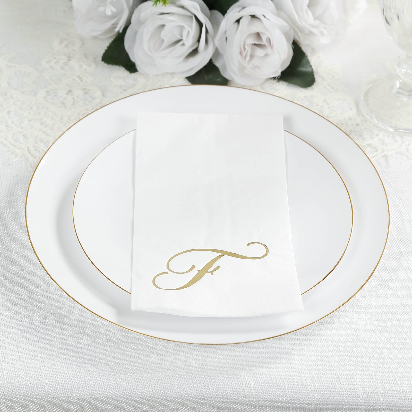 100 Paper Dinner Napkins White with Gold Foil Monogram "F" – 8"x4" Folded, Disposable Party Napkins